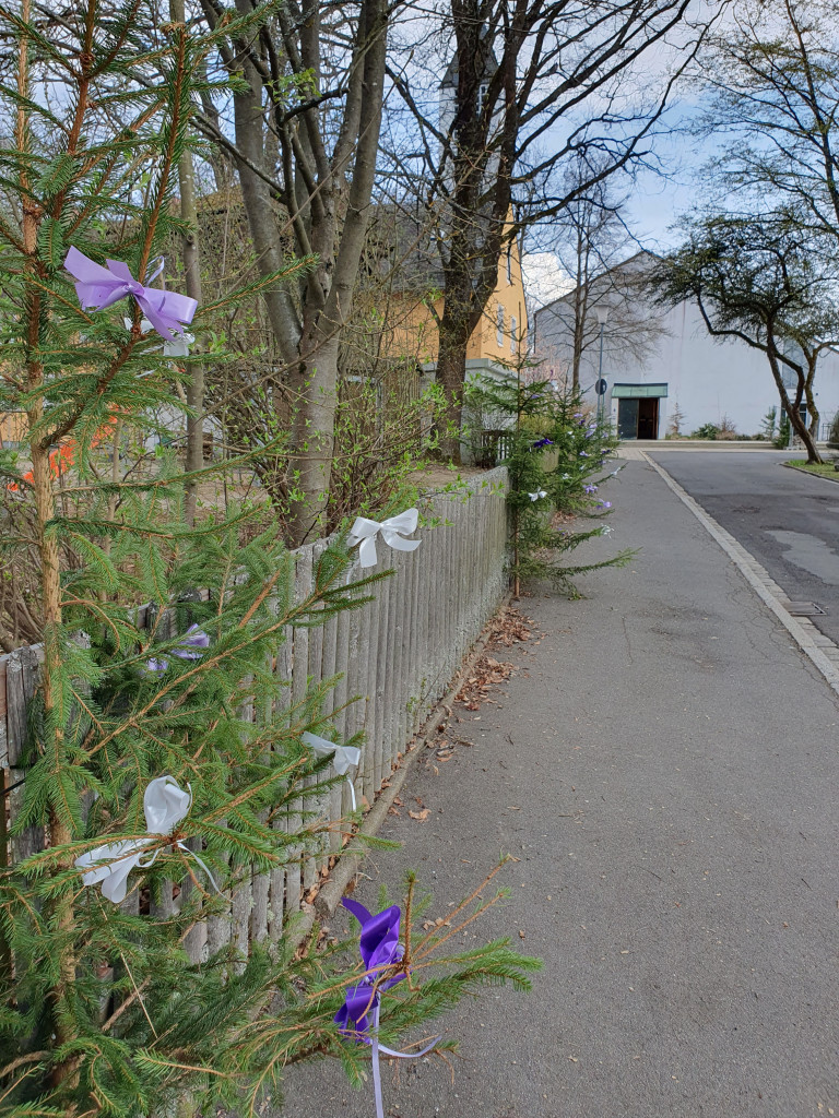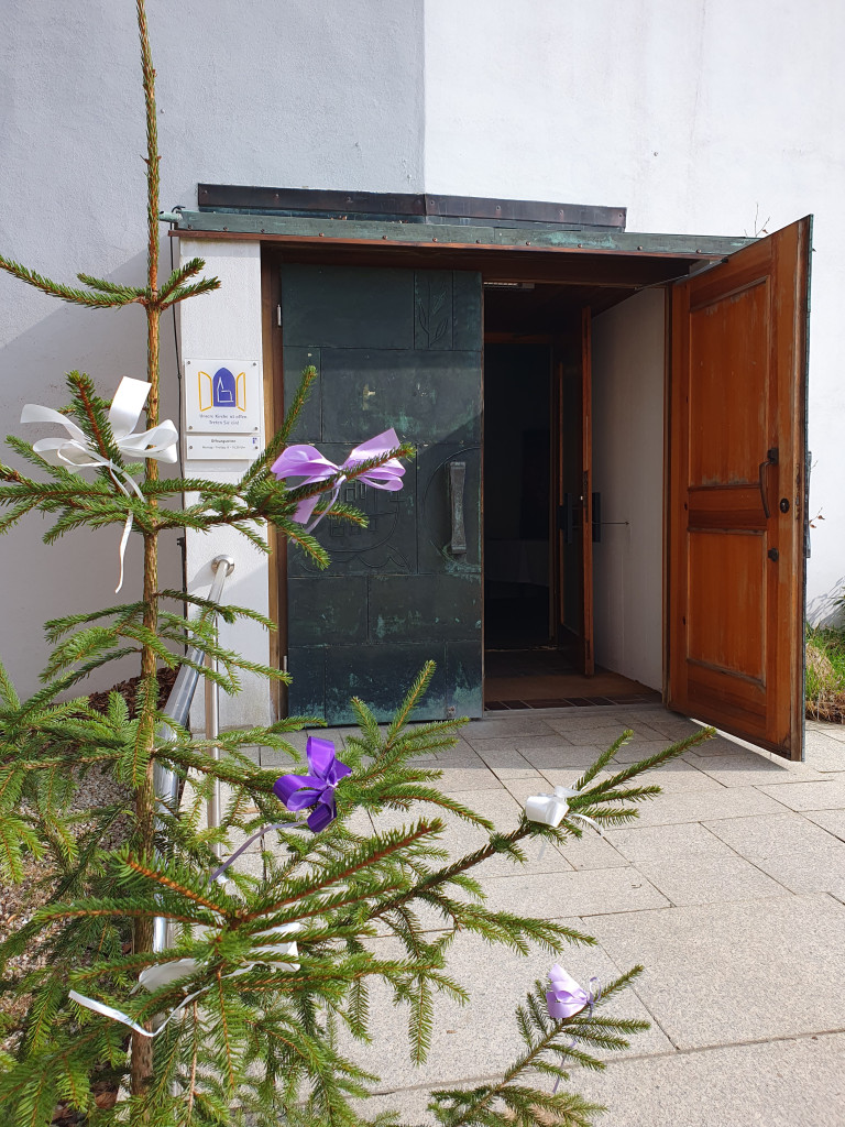 Mit Bäumen geschmückte StraßeKircheneingang mit FichteAltar mit BlumenBlumenschmuckKonfirmationskreuze im Taufstein
