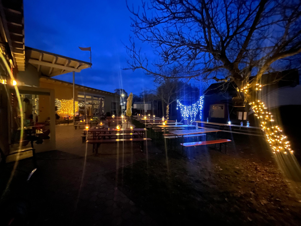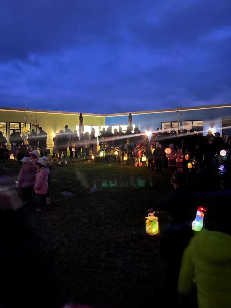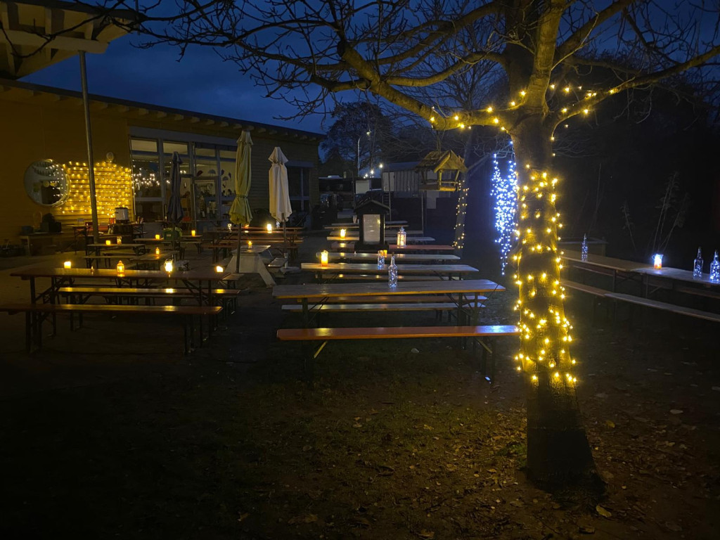 Nikolaus-KiTa im LichtermeerBeleuchtete Bäume und KiTaEgertaler BlaskapelleAufführung der KinderSitzbänke im stimmungsvollen GartenAufführung und Laternen
